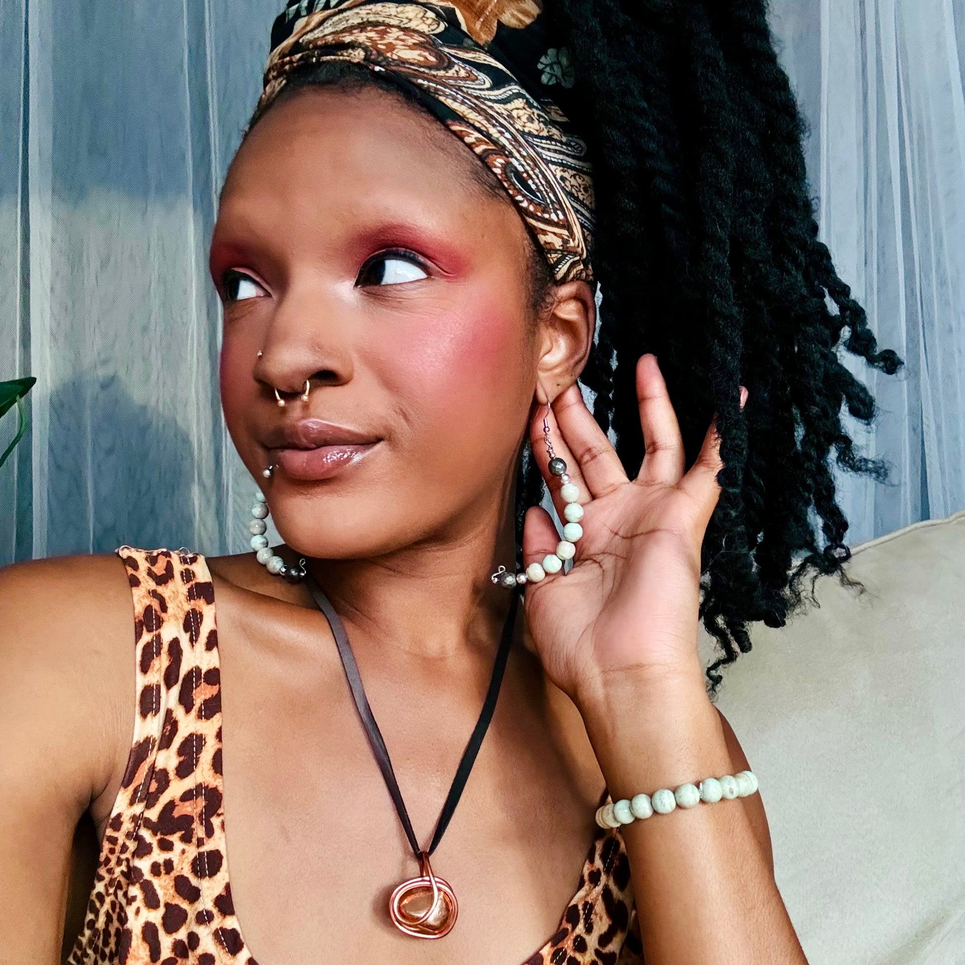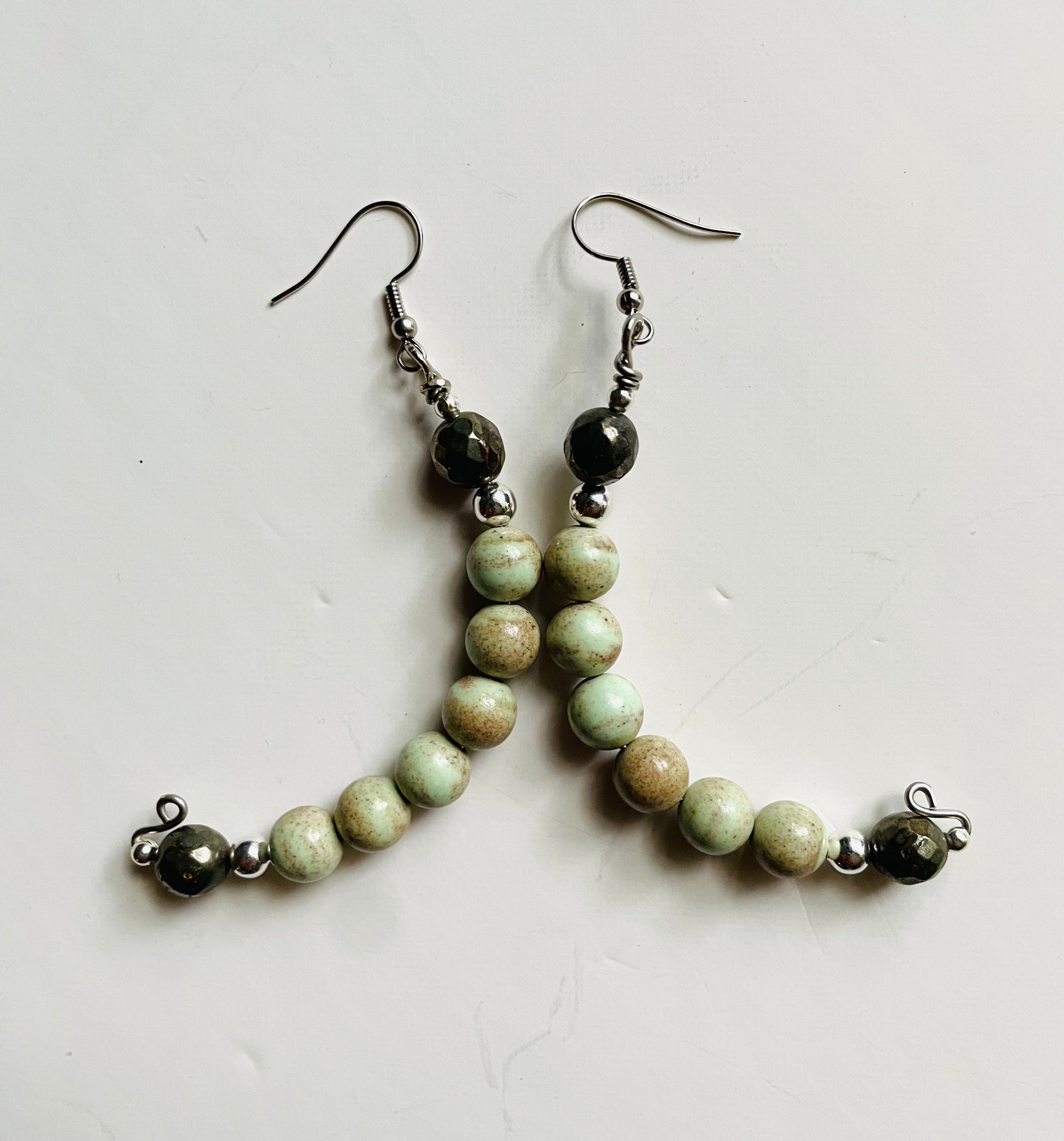 Unique handmade bent dangle Sea Foam Green Calcite and Pyrite beaded earrings. Add subtle style to any outfit!
